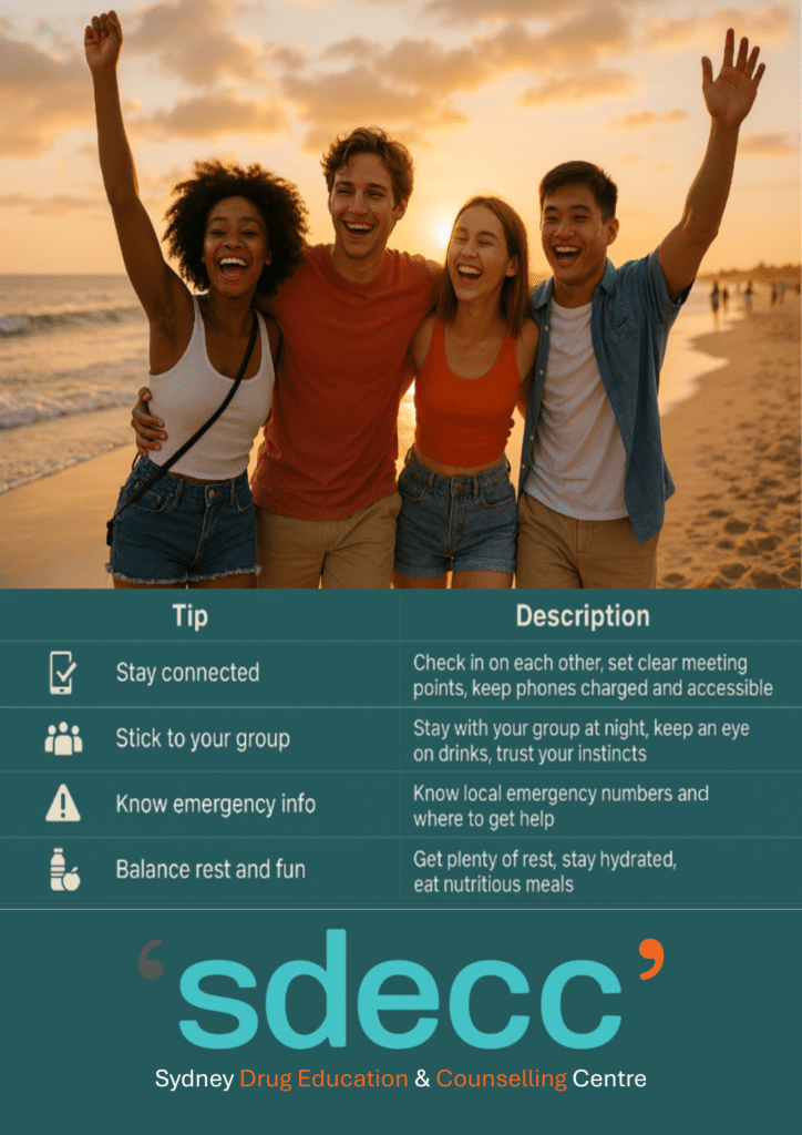 However, as school leavers prepare to embrace this exhilarating time, it’s essential to make wise choices regarding alcohol and other substances. Taking a mindful approach can help ensure that celebrations remain safe and enjoyable for everyone. While there may be pressure to drink or experiment with drugs during schoolies, it’s important to remember that a fantastic time can be had without them. Consider setting personal boundaries around drinking, being aware of how substances can affect your mood and decision making and not being afraid to say “no” if you’re feeling uncomfortable. By making informed decisions, you’ll be able to truly celebrate your achievements and make the most of this special milestone.